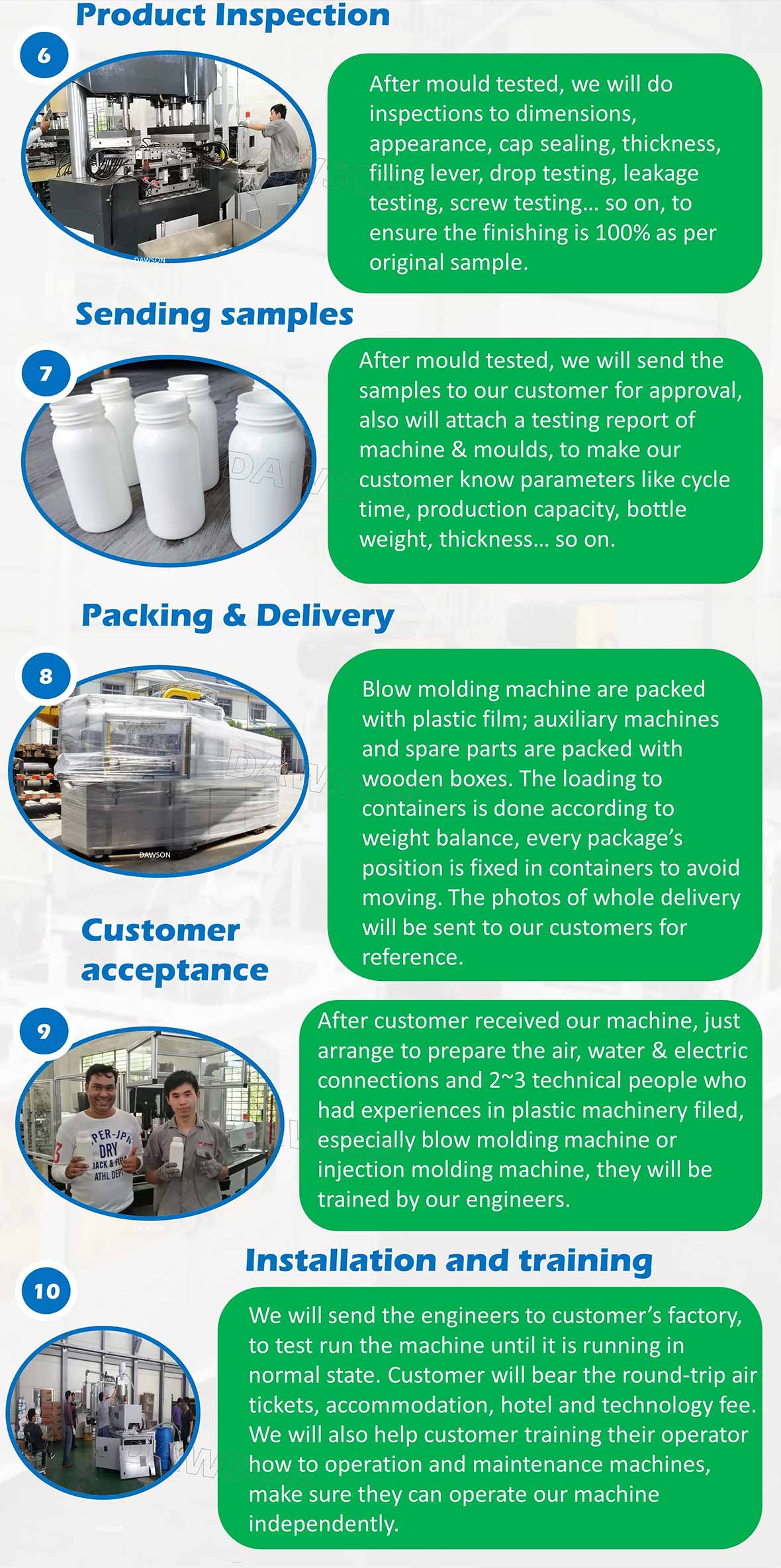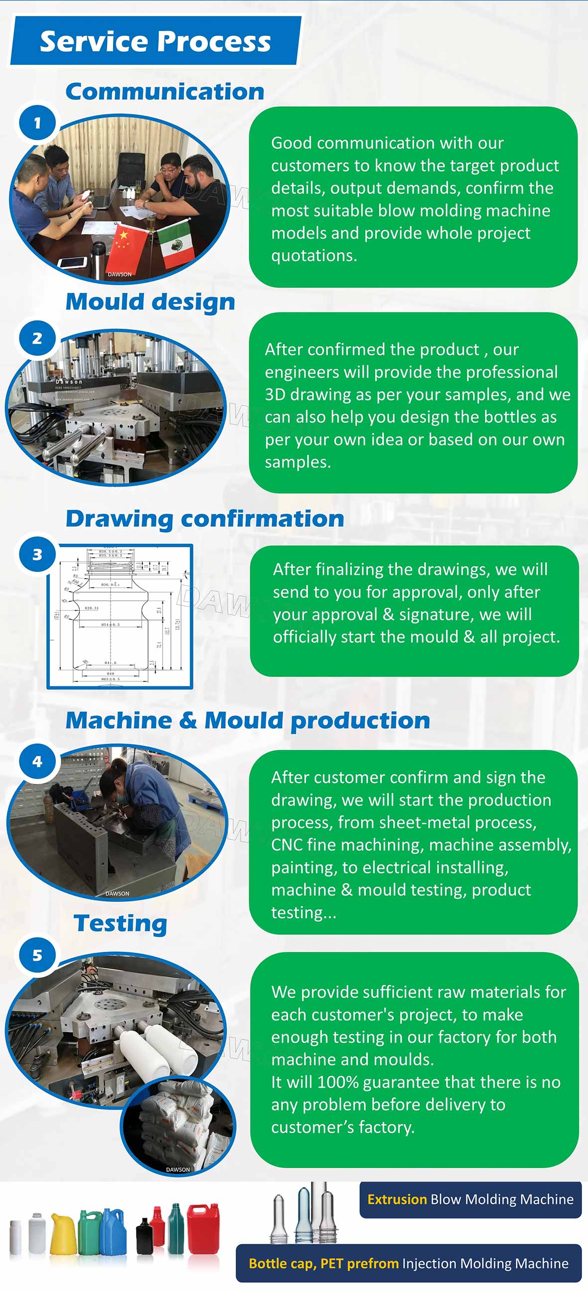 DAWSON предоставляет клиентам проекты «под ключ».Включая проектирование завода, установку пластиковых машин и пресс-форм, отладку, мы также можем предоставить клиентам вспомогательное оборудование.Мы можем отправить полный комплект машин после тестирования на нашем заводе.Это сэкономит много денег и времени.